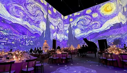 Decidimos envolver a los invitados dentro de una pintura en movimiento de Van Gogh, llenamos el ambiente de fragancia de lavanda y girasoles, mientras un pequeña orquesta tocaba Yellow de Coldplay.